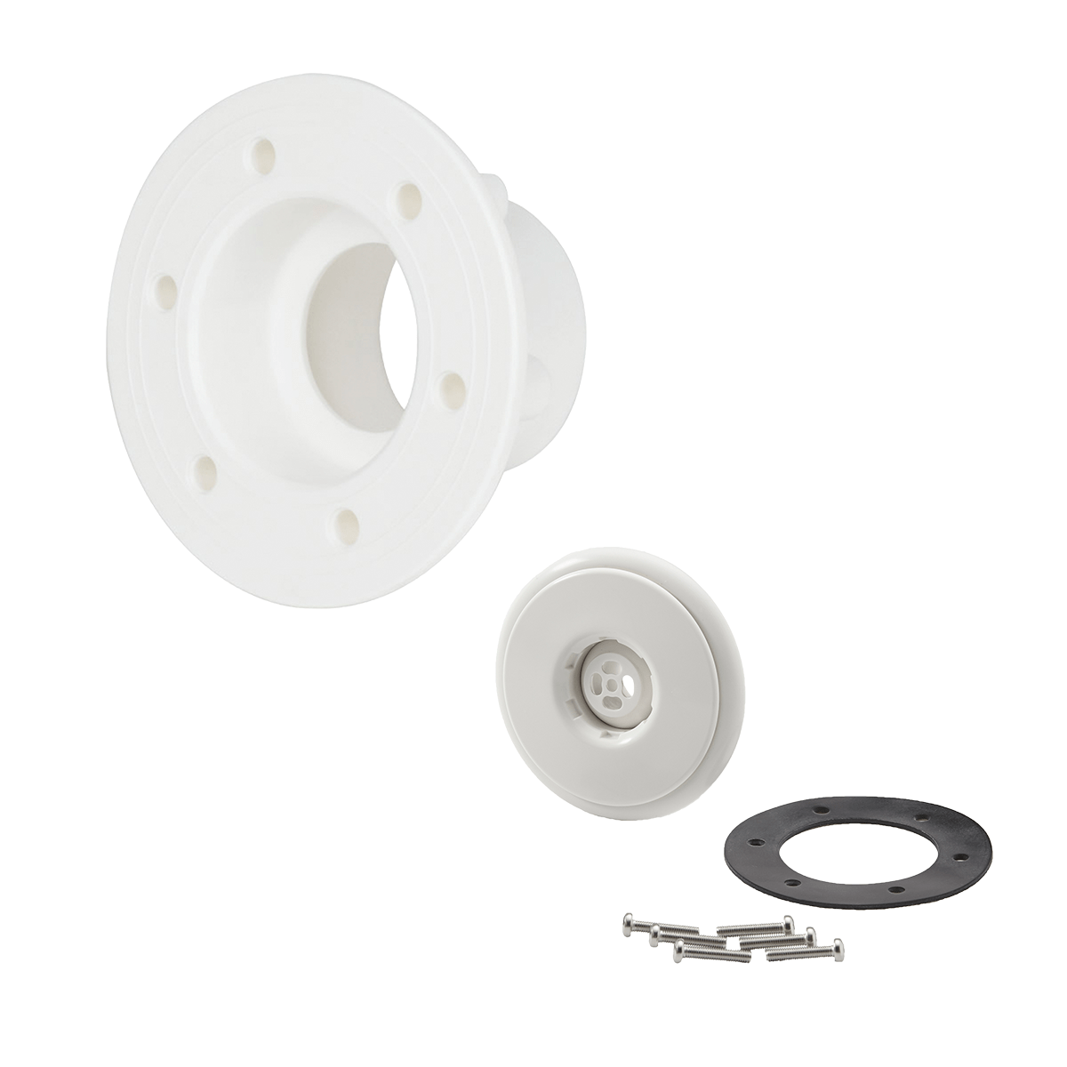 Set bestehend aus Einströmdüse, Anschlussstück PT mit Klebeanschluss d50/63, 2 Flachdichtungen und PT-Schraubenset.